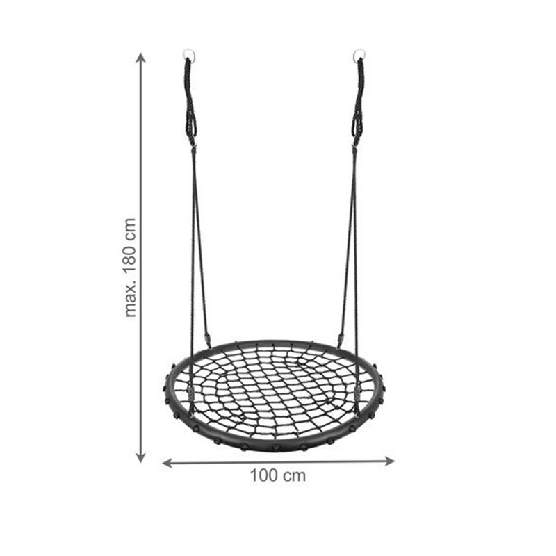 PRIESTOROVÉ SEDADLO - priemer sedadla je 100 cm , čo zaisťuje pohodlie pri používaní a umožňuje hrať sa na ňom aj niekoľkým deťom. Sedák je vyrobený z pletených PE lán, ktoré poskytujú dobrú priľnavosť. Hojdačka má kvalitný materiál , vďaka ktorému je konštrukcia odolná voči poveternostným vplyvom.