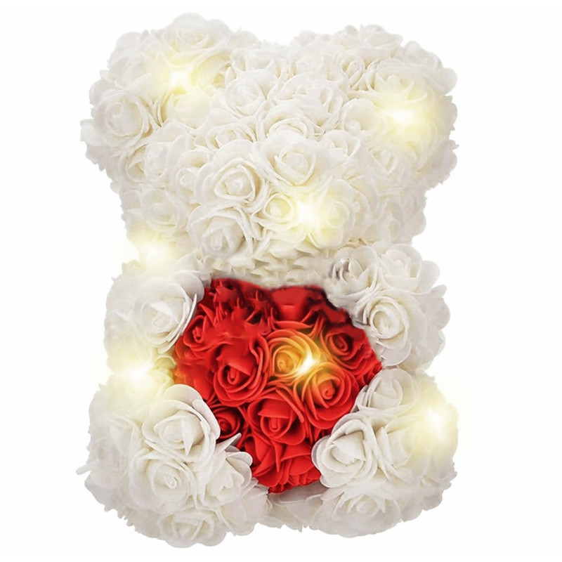 Plyšový medvedík s bielymi ružami s červeným srdiečkom. Perfektný nápad na valentínsky darček alebo netradičný darček. Medvedík má dodatočné neutrálne biele LED podsvietenie. :)