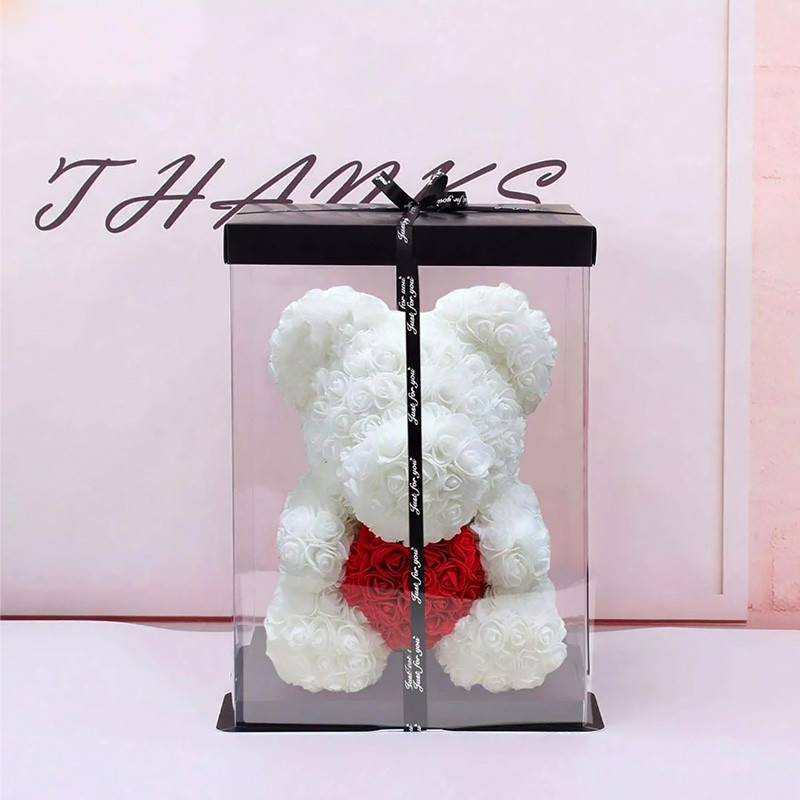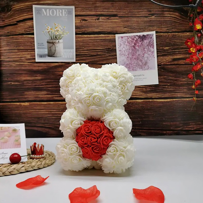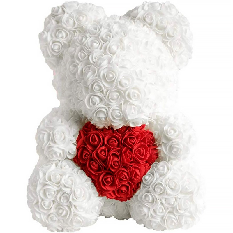 - Plyšový medvedík s bielymi ružami s červeným srdiečkom.