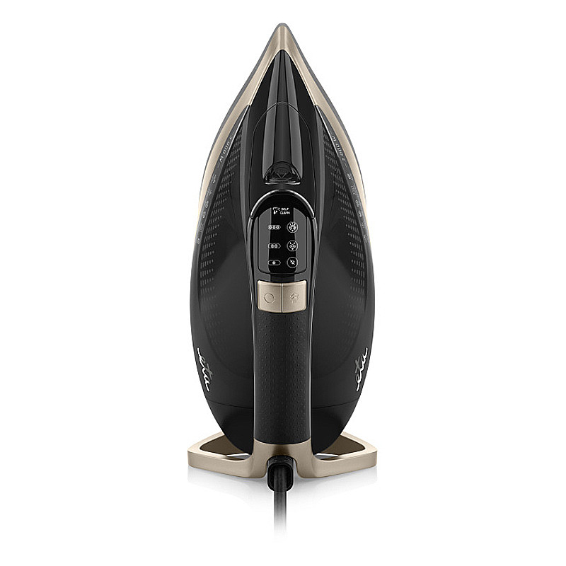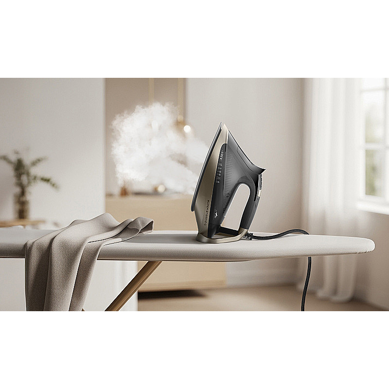 Žehlička je vybavená farebným LCD displejom, ktorý prehľadne zobrazuje nastavenie teploty, intenzitu naparovania a funkcie. Senzor dotyku v držadle aktivuje naparovanie až v momente, keď ju držíte v ruke, takže šetrí energiu aj vodu.