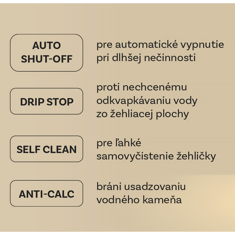 Bezpečnosť zaisťuje elektronika AUTO SHUT-OFF, ktorá žehličku automaticky vypne pri nečinnosti alebo jej náhodnom prevrátení na bok. Funkcia DRIP STOP ochráni bielizeň pred nechceným odkvapkávaním vody, zatiaľ čo ANTI CALC bráni usadzovaniu vodného kameňa a predlžuje životnosť zariadenia. Naparovanie zabezpečuje výkonné integrované čerpadlo, ktorá sa stará o rovnomerný výstup pary bez výkyvov.